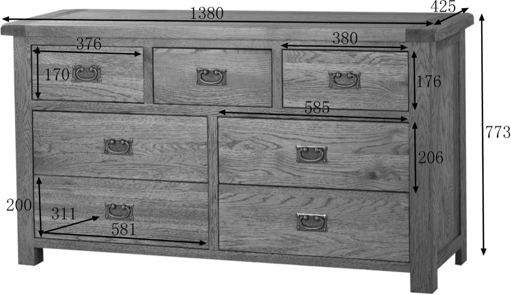 Rustic Oak 3 over 4 wide chest – H 77cm x W 138cm x D 42.5cm